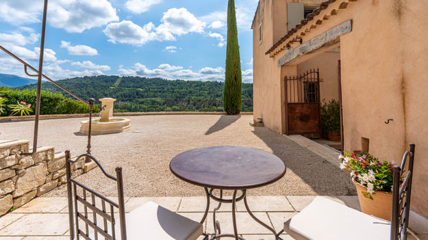 Suite dont l'accès se fait par un magnifique escalier en fer forgé depuis le salon et donnant sur une grande terrasse équipée d'un salon de jardin surplombant la piscine et la grande cour avec sa fontaine provençale.